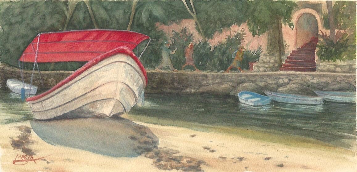 This piece was inspired by the many dinners over the years at Ramones Huachinago Restaurant on the beach across from the river from the Casa in Boca de Tomatlan, MX. It was later turned into a 12″x 22″ oil, (see in menu, Landscapes > Studio)